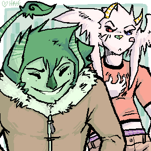 I think one of my favorite themes to draw is "the boys." Here's Feniks looking irritated that his clothes are too tight, and Braven being generally jovial, which is befitting both of them! I'm still very fond of this pic...